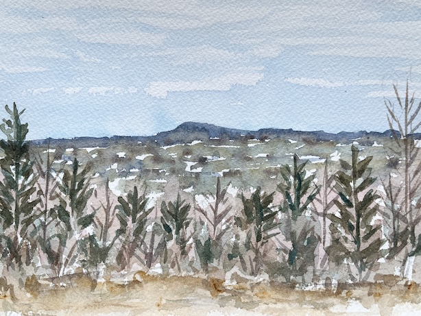 Akvarellimaalaus, jossa keväinen vuori- ja metsämaisema