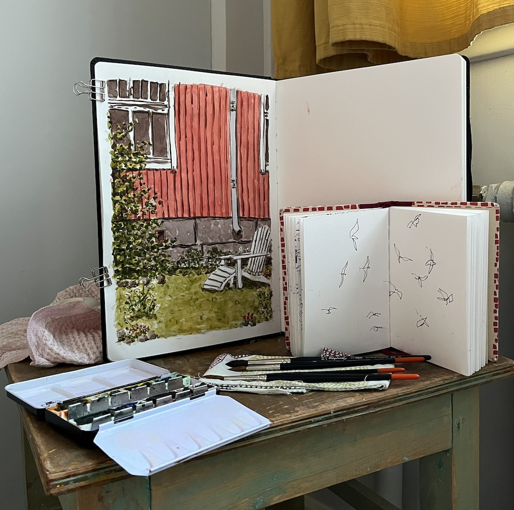 Akvarellia maalasin iltapäivähelteessä puutarhassa, mustekynäkuvan tein kun kävelin auringonlaskun aikaan metsäkallioilla ja yläpuolellani lenteli suuri lokkiparvi. Otin nopeasti pienen luonnoskirjan ja mustekynän esiin, ja yritin vangita lokkien liitelyä ja kaartelua yläpuolellani katsomatta paperiin.