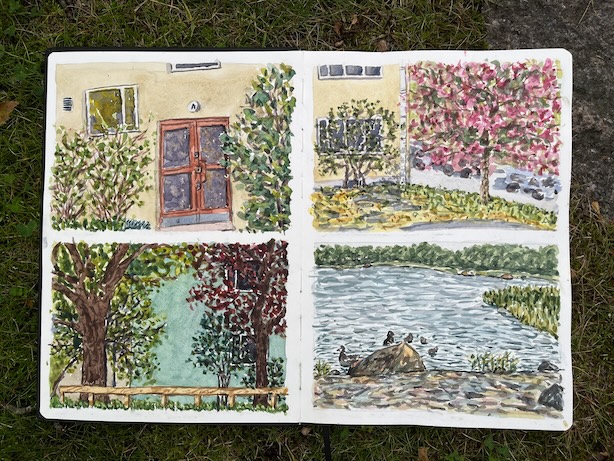 Muutin toukokuun lopulla. Koko muuttoviikon ajan sattui olemaan upea sää, joten menin päivittäin ulos pihalle ja lähialueille luonnostelemaan. Se oli hyvä tapa pitää taukoa, mutta myös paeta hetkeksi loputtomalta tuntuvaa pakkaamista ja siivoamista. Tein jokaista kuvaa usean päivän aikana, aina puoli tuntia tai tunnin kerrallaan. Värin kuivuessa tuoksuttelin kukkivia puita ja katselin naapuruston alkukesäistä elämää. Kun palasin asunnolle, jaksoin taas vähän paremmin muuttopuuhien parissa.